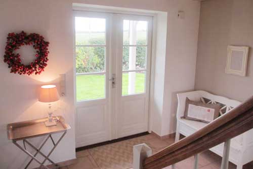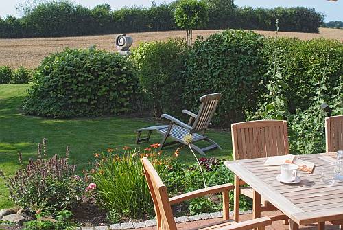 Der gepflegte Garten und die Terrasse mit freiem Blick über die Felder laden ein, zu bleiben und zu genießen.